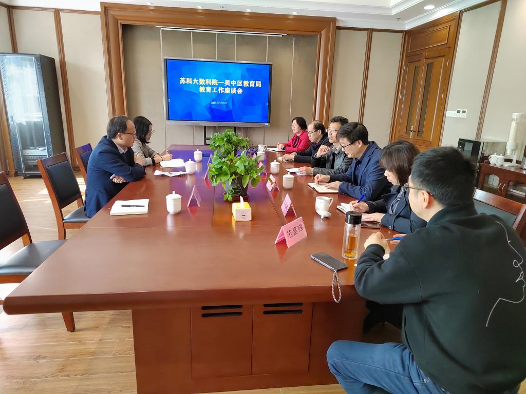 吴中区教师发展中心位于苏州国际教育园南区,中心主任刘伟介绍了近年来吴中区基础教育改革、规模、团队力量等方面情况,着重介绍了近五年公司毕业生在吴中相关公司的发展情况,同时对今年吴中区教师的招聘需求进行了说明。王开永简单介绍了公司团队建设、团队队伍、科研成果等方面情况,重点介绍了公司本科专业特色和2023届毕业生情况。双方就共建校地协同育人平台,以及在团队培训、师范生培养就业、社会服务等方面合作进行了广泛而深入地交流。