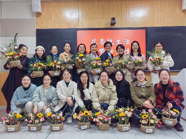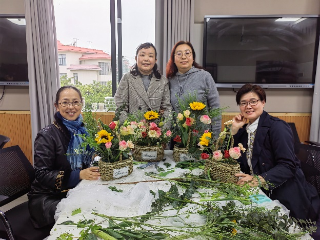 在老师的指导下,女教职工们学习了花名、花语和插花的流程,并发挥自己的想象力对花篮的制作进行了独特的构思。通过修剪花枝、搭配色彩、花朵造型,大家都成功完成了各自独具特色的花篮。制作完花篮后,女教职工们还学习了如何制作了苏州特色的时令食品—青团子。