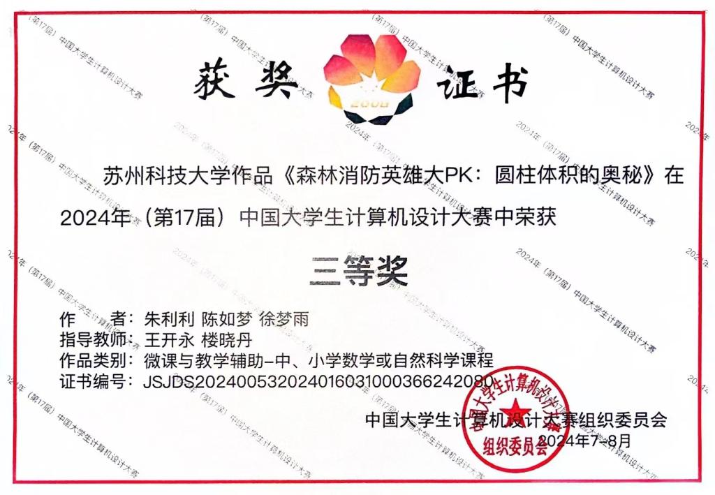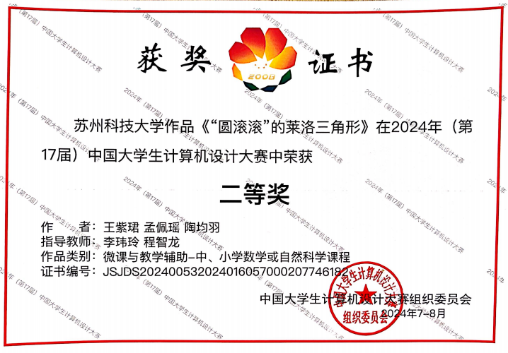 公司王紫珺、孟佩瑶、陶均羽团队的作品《“圆滚滚”的莱洛三角形》(指导教师:李玮玲、程智龙),朱利利、陈如梦、徐梦雨团队的作品《森林消防英雄大PK:圆柱体积的奥秘》(指导教师:王开永、楼晓丹)在微课与教学辅助类别分获全国二、三等奖。
