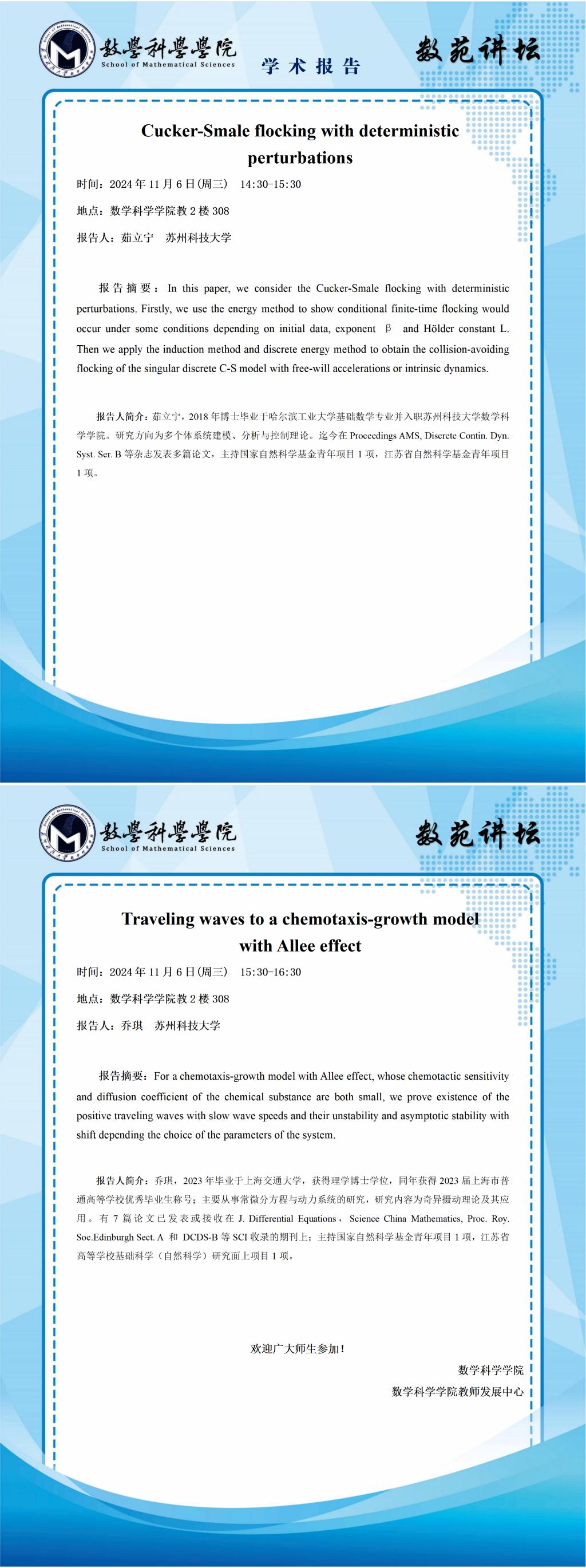 【数苑讲坛】第一讲:Cucker-Smale flocking with deterministic perturbations,Traveling waves to a chemotaxis-growth model with Allee effect